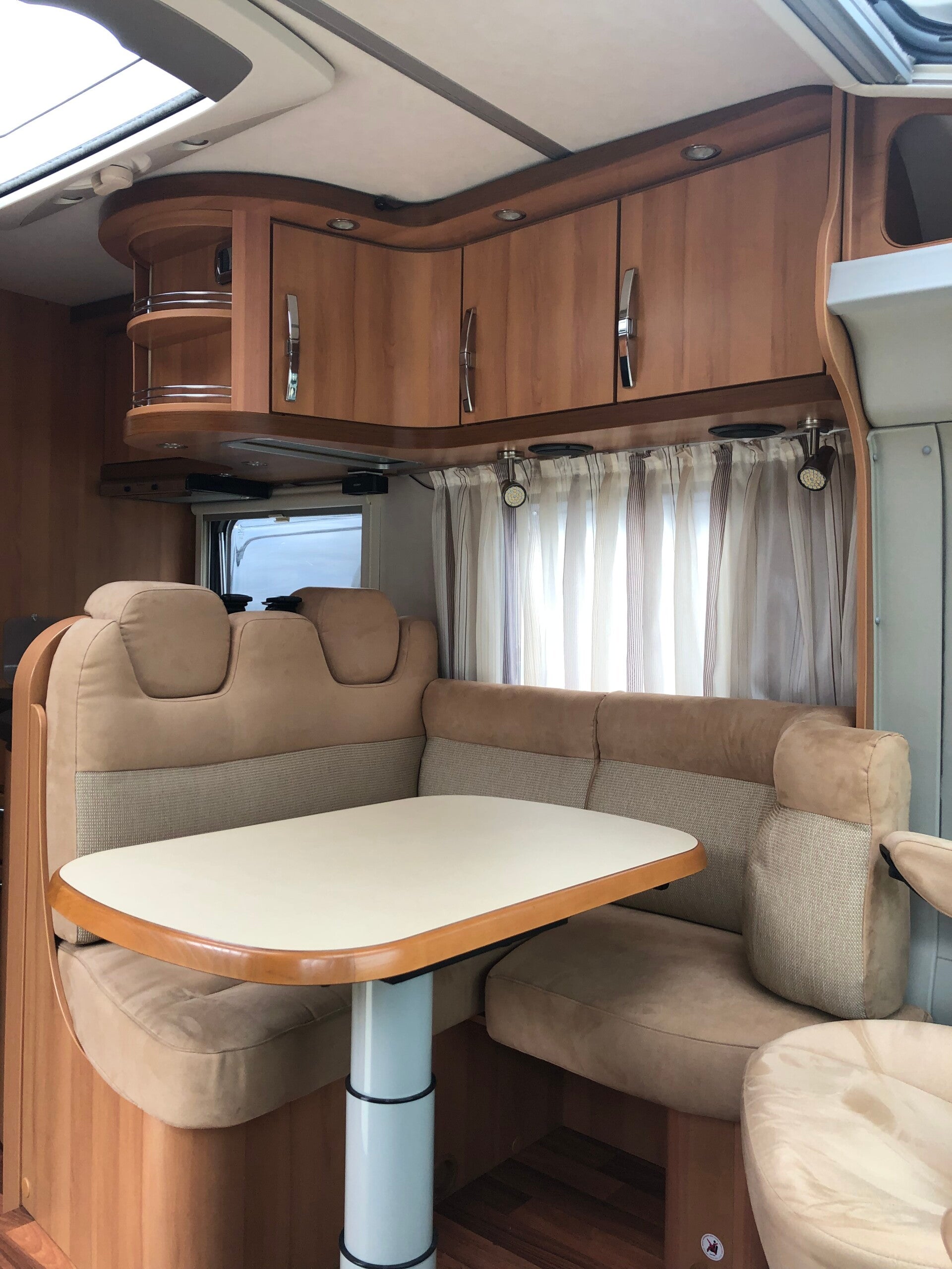 Zeer ruime separate douche / toilet ruimte, ruim verstelbaar Queensbed met heel veel bergruimte in en om de camper, en een grote gezellige zithoek met tal van mogelijkheden, en om te bouwen naar een 3e en 4e slaapplaats. De keuken os in hoek opstelling, met 3 pits gas, en grote koel vries combinatie. De draaibare pilotenstoelen kunnen bij de zithoek gedraaid worden waardoor een heerlijke leefhoek ontstaat. Deze camper is ideaal voor mensen die lang onderweg zijn, van off grid staan houden. Uiteraard ook geschikt voor kortere trips
