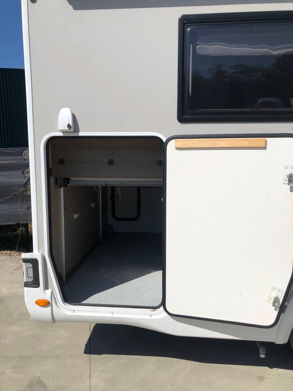 Achterin de camper een ruim 2 pers centraal bed en zgn Queensbed, midden in de doucbe / toilet ruimte, links en rechts binatie reis / verblijfs wagen zoeken. In en om de camper is veel bergruimte. Onder het Queensbed bevindt zich de XXL garage.