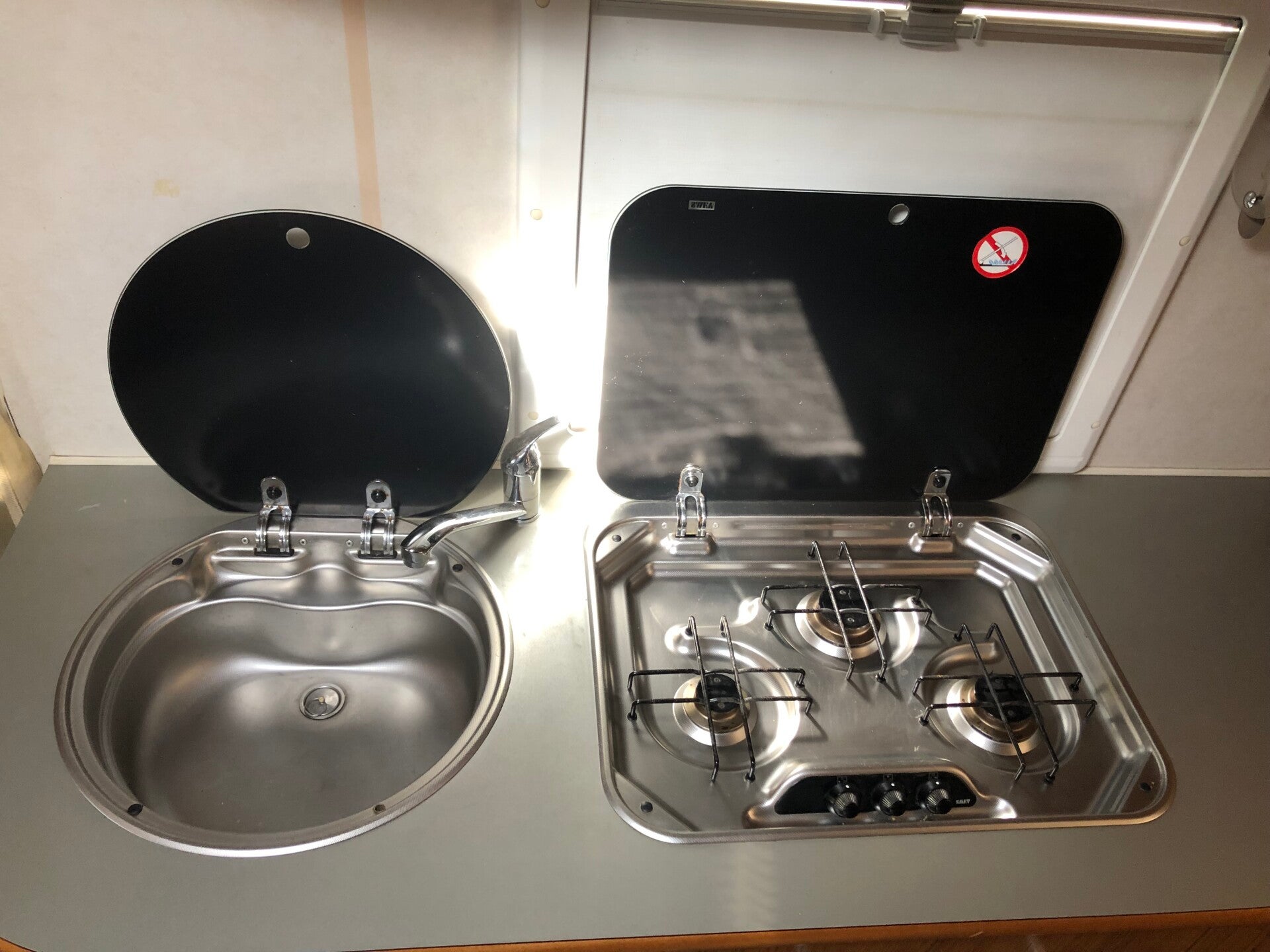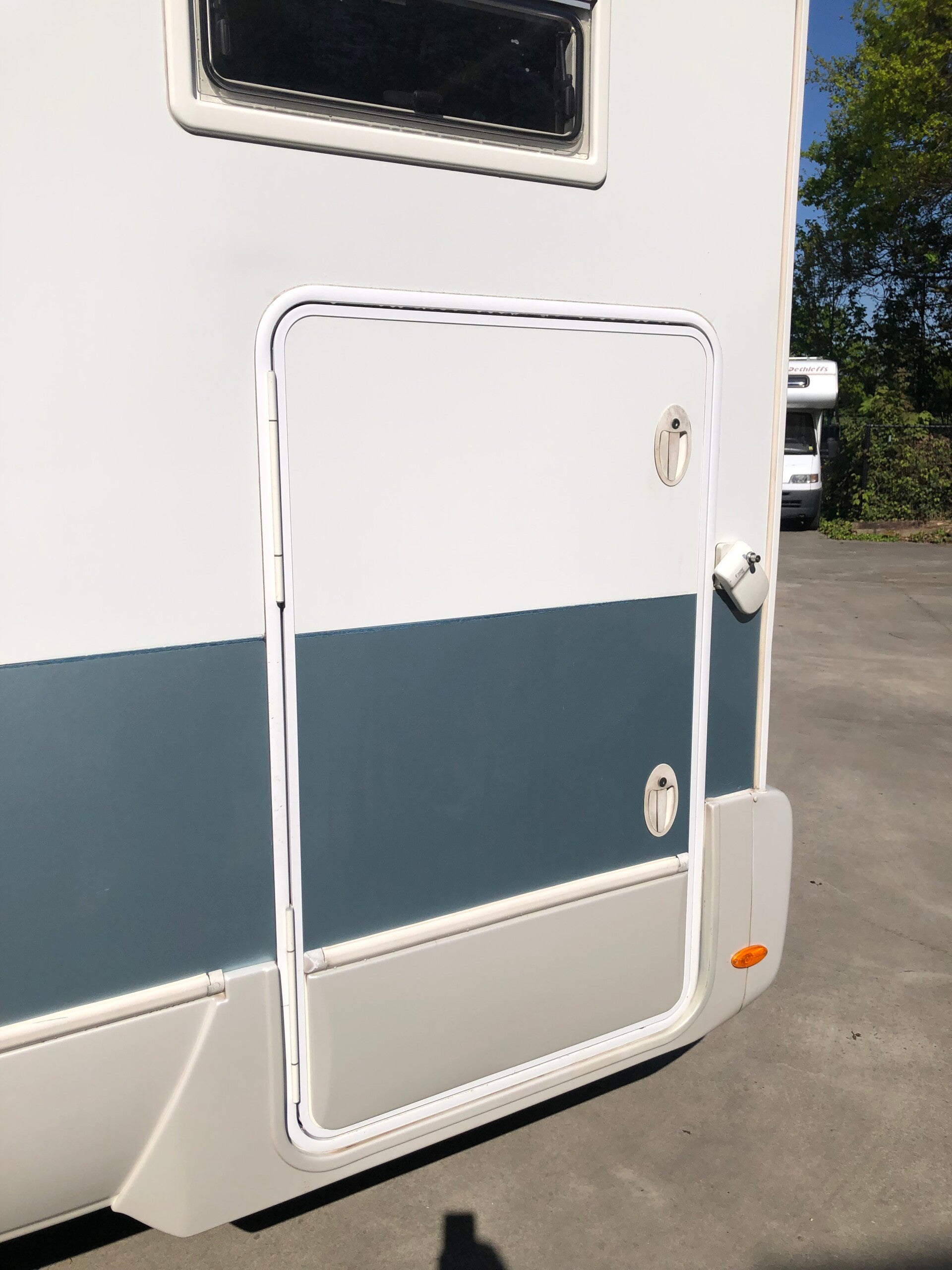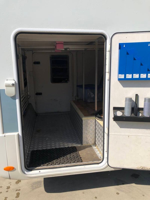Achterin een groot vast twee persoons bed, met daaronder een XXXL garage waar met gemak een enduro motor of bijv 2 crossmotoren in kunnen, badkamer met aparte douche en toilet ruimte. De zeer ruime keuken is voorzien van warm en koud stromend water en een drie pits gasstel. Een bakoven en grote koel vries combinatie maken het geheel af. Er kan met 6 personen gereis én geslapen worden.